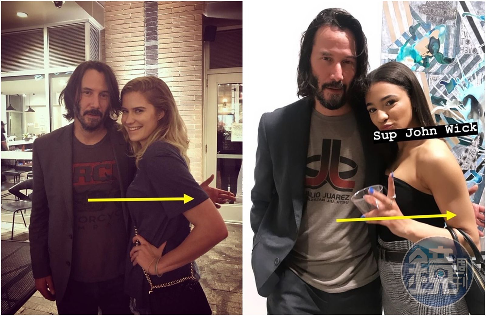 有網友發現基努李維在與女性合照時,總以「紳士手」避免觸碰到對方身體。(翻攝KemziLinzi推特)