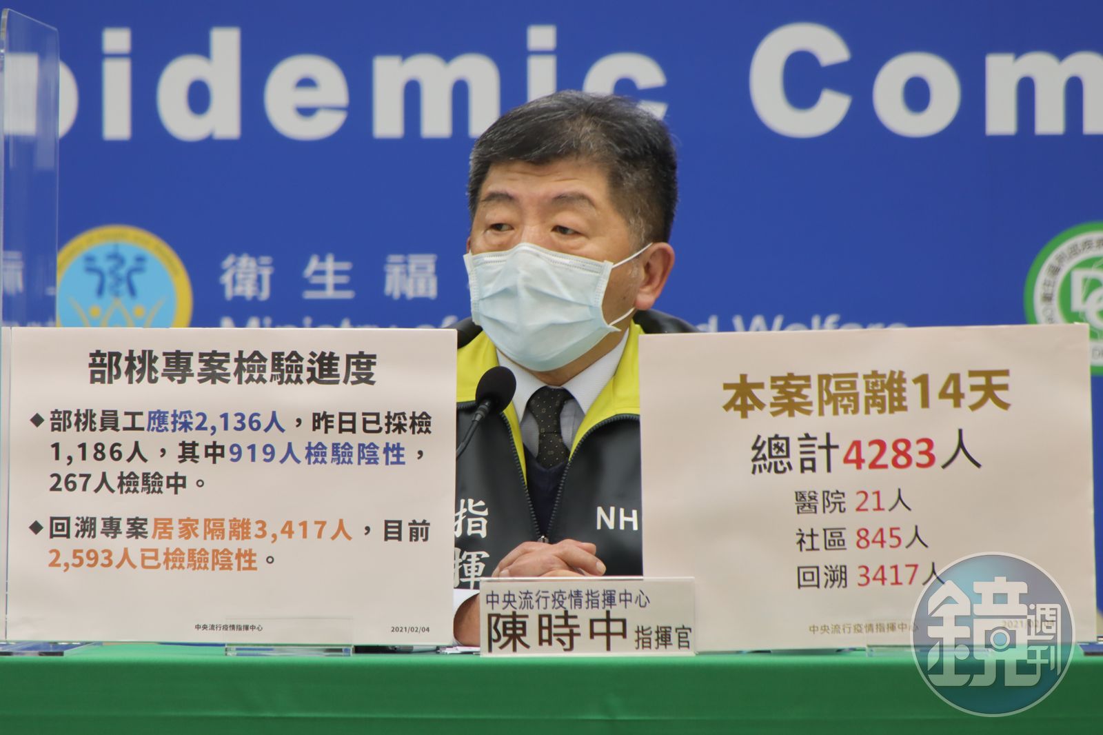 針對部桃院內群聚感染,陳時中指出,目前已匡列4,283人進行14天居家隔離,包含醫院21人、社區845人、回溯3,417人。至於國人關注的案889也擴大匡列166人,總計採檢442人,其中有1人陽性(案908)、其餘442人為陰性,而案908的4名接觸者採檢皆為陰性。
