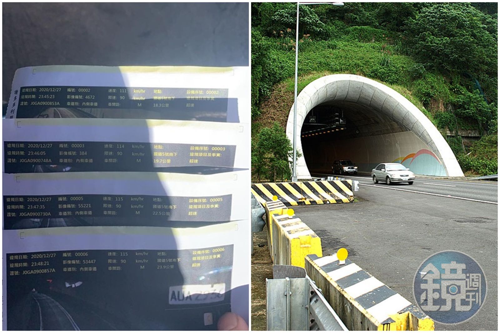 原PO在臉書社團「宜蘭知識+」PO出一張手握「4張罰單」的照片,透露去年12月27日晚間11點45分至48分,他以時速111至115公里的速度行駛於國道5號雪隧南下車道,在短短3分鐘內竟被連開了4張超速罰單。