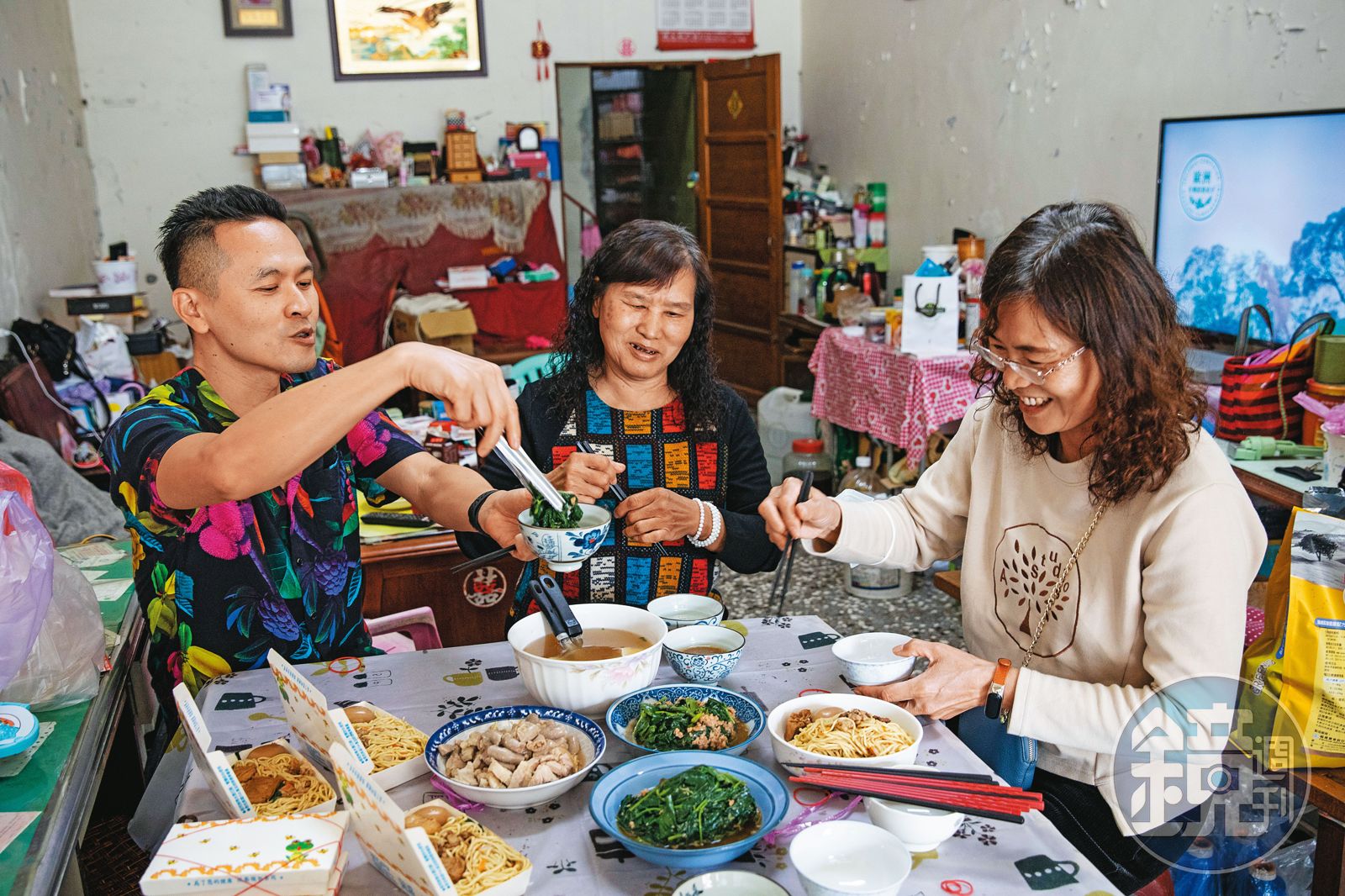 採訪那天,陳思宏的大姊、二姊特地在老家等我們拜訪。當年擁擠喧鬧的老厝,如今只剩大姊,有錯字的匾額正對大門掛著,地板堆滿家庭手工織布材料。在一桌午餐前,陳思宏和二姊講話連珠、聲量如內建麥克風,大姊插不上話,被陳思宏指使泡咖啡,卻被又嫌棄像水,3人一來一往,聊起家中欠債消失的長男、17歲意外過世的么女,還有母親的喪禮,那天火葬場一團亂,燒完的骨灰飄向荔枝園,姊弟3人忍不住碎嘴,「真不確定推進去(燒)的那個是不是媽?推出來的是不是媽?」