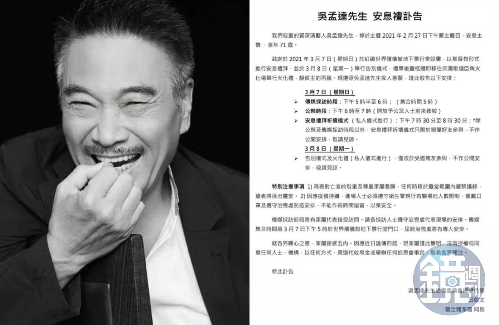 從吳孟達罹癌開刀住院消息傳出開始,一直是他對外發言代表的田啟文也透露,喪禮當日會有家屬代表,在他的陪同下接受訪問,回應一些大家關心的問題。當天除了公祭時段,從下午6時至7時開放給公眾人士致祭,其餘儀式都不會公開。至於大家關心的吳孟達昔日夥伴周星馳會不會前來並參與扶靈,田啟文表示喪禮還沒有決定扶靈名單以及步驟。