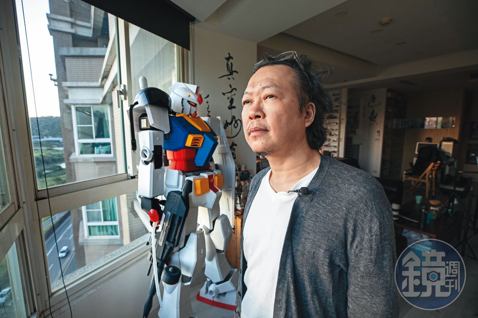 眼前是一尊180公分高的機動戰士鋼彈,如果不是因為鋼彈肩膀上放著瓜皮安全帽,高樓公寓外又能看到新店區的山河景色,還有52歲的微縮藝術家鄭鴻展幫我們開門,我們或許會以為:剛剛是不是穿過哆啦A夢的縮小隧道,所以進入鄭鴻展的微縮作品《漢克家的鋼彈》了?