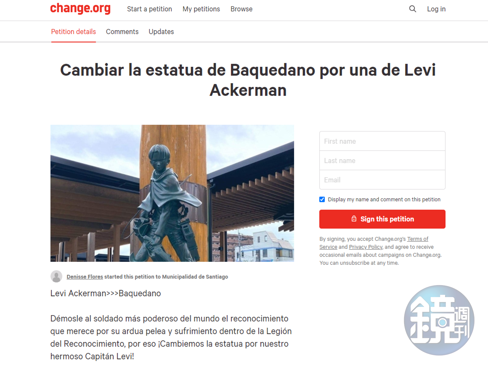 佛洛雷斯於3月6日透過「change.org」網站發起連署,內容提到:「讓我們給這位世界最強士兵一個該有的認可,他在調查兵團內辛苦奮鬥、嘗盡苦頭。讓我們把雕像換成美麗的里維兵長吧!」該提案自發起至結束,共獲得7萬2,000多人支持,距離當初設立的門檻7萬5,000人,只差臨門一腳。雖然這份連署惡搞成分居多,不過端看龐大的響應人數,《進擊的巨人》在南美洲的火紅程度可見一斑。