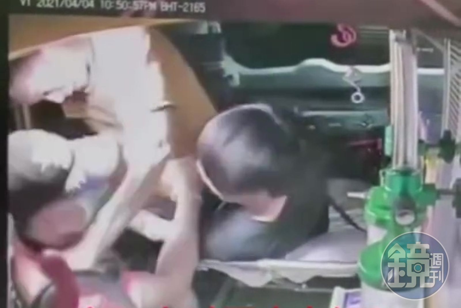 期間醫護人員嘗試以身體壓制對方,仍難擋年輕人的力氣,救護車司機見情況不對,也停車趕緊到車廂內幫忙阻止。司機上車後壓制住擔架上惡少的手臂,但惡少似乎還不覺有錯,仍趁機用手掌偷打司機、情緒十分激動。