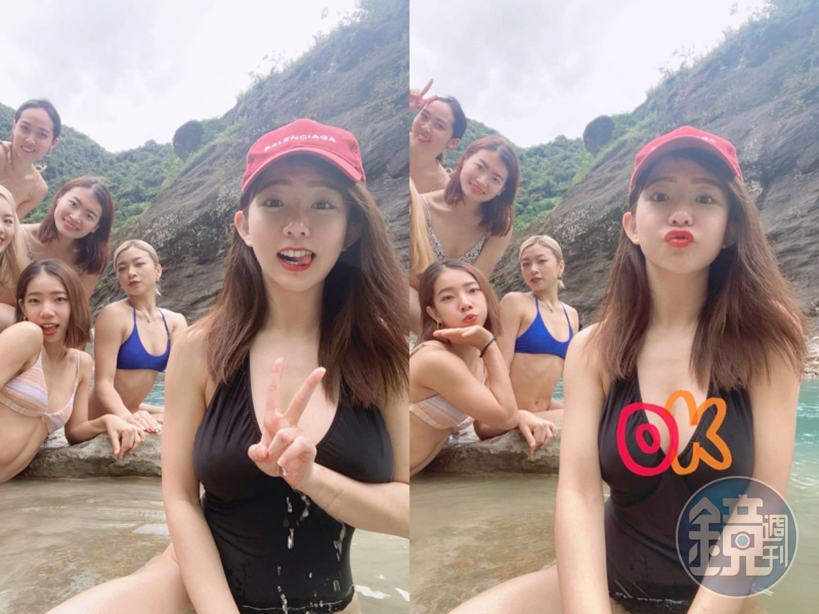 郭書瑤最近與自己的伴舞「瑤瑤girls」一起員工旅遊,一行人為作紀念全都泳裝入鏡,在溪水旁各自擺出性感可愛的姿勢拍照,在最前方應是負責掌鏡的郭書瑤也一身黑色低胸泳裝,不過合照上傳到IG時,卻是1張以「OK」貼圖把重點部位的乳溝蓋掉、1張則比「YA」的手勢巧妙遮住。