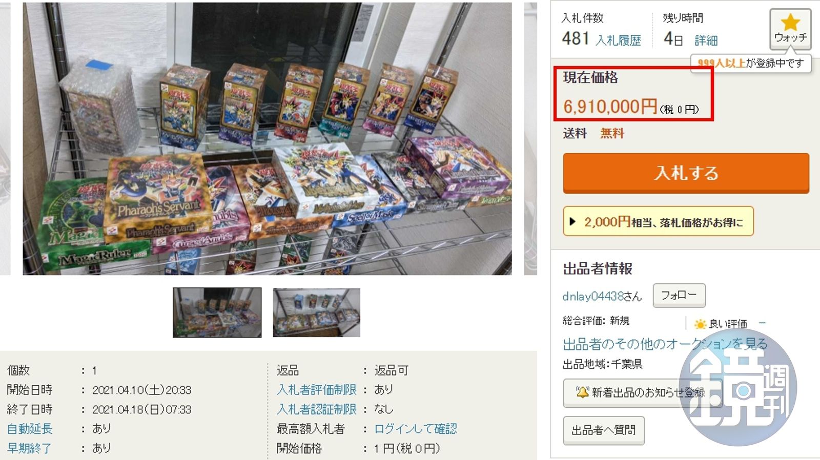 據該名人妻貼出的照片來看,這些《遊戲王》卡牌都沒拆封,且是早期的商品,目前幾乎都絕版了,吸引收藏玩家的注意,上架3天已有超過480人參與競標,價格更是已到691萬日圓(約新台幣181萬元),預計在4月18日上午7時33分截標。