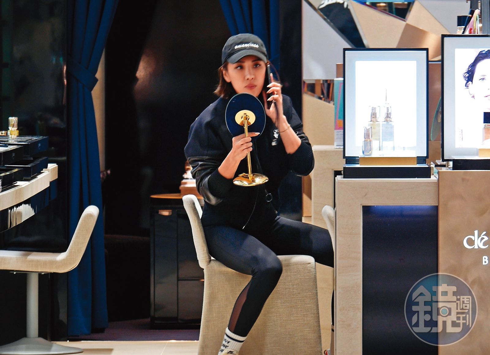 7日傍晚,小禎穿一身深色運動服、頭戴帽子現身台北市信義區的百貨公司,她拿著手機講電話,臉上並無任何表情,隨後走進化妝品專櫃,和專櫃小姐聊了一會,開始試用產品,不久又邊講電話邊拿化妝鏡看臉上試用的效果。