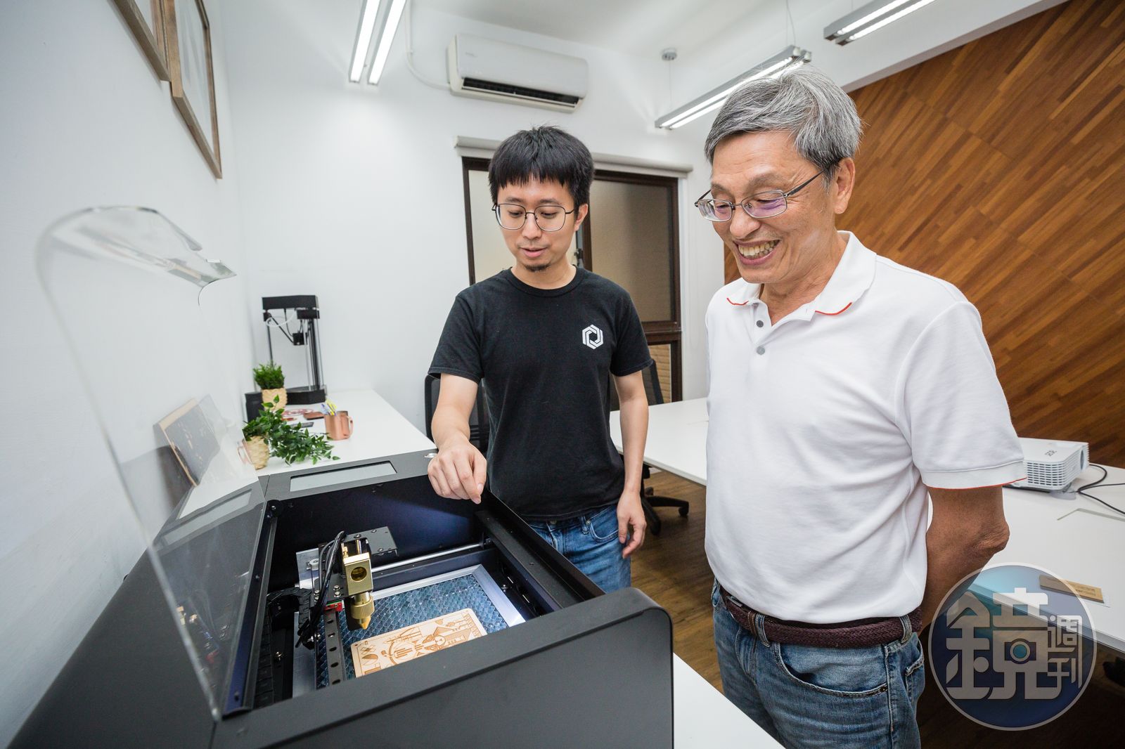 回台灣後,柯軒恩等開始著手做出產品,現在主要以3D雷射切割機為主,「我們產品優勢是一台機器可以換不同噴頭,還有就是價格便宜,一台不到4萬,很好入手…」Flux的3D雷射切割機,應用面很廣,從建築模型到皮雕都可以用。陳五福邊看著柯軒恩示範機器邊開心笑說:「買一台去夜市擺攤,賣自己設計的皮雕鑰匙圈啊什麼的,一個月就回本了…」