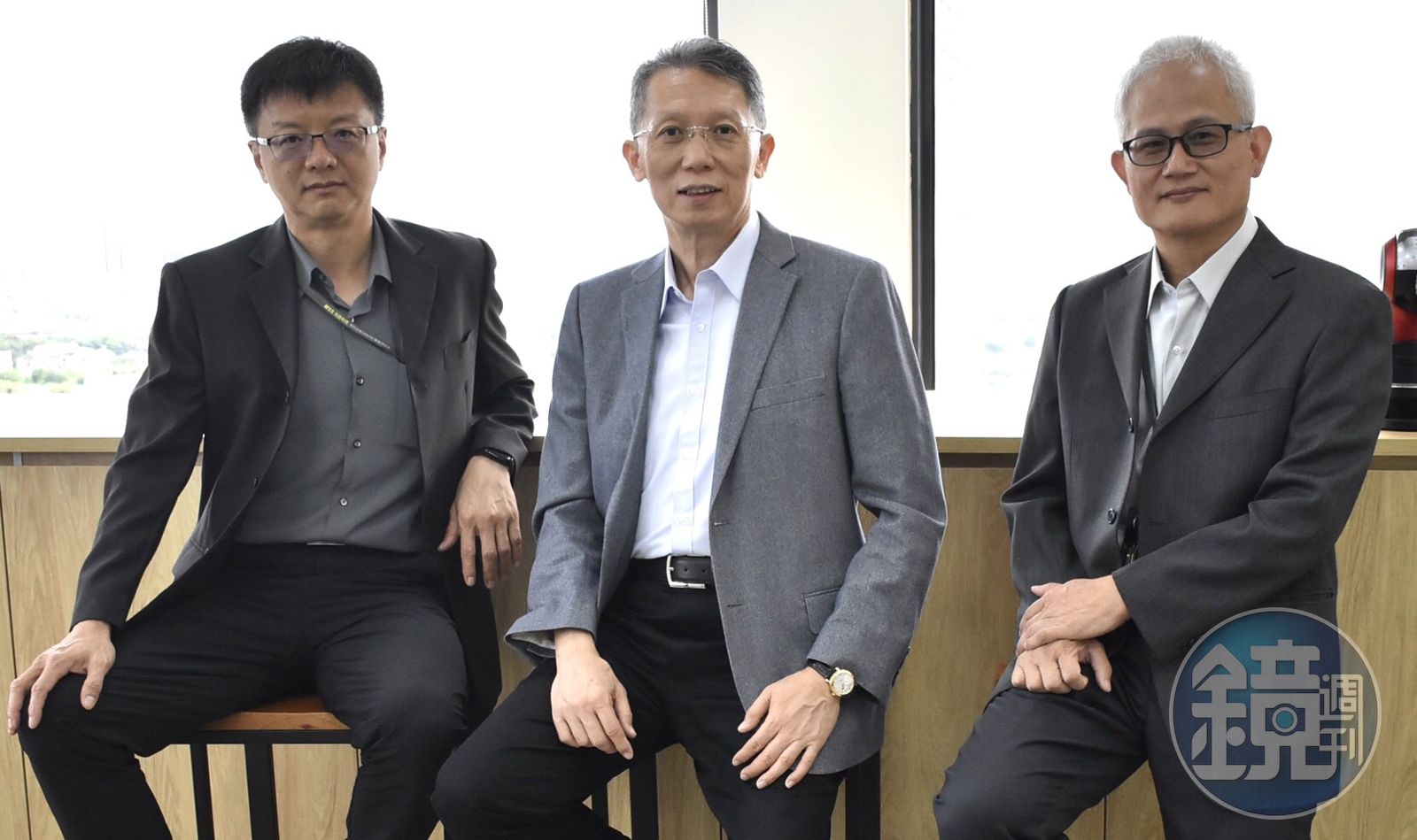 受惠於半導體大廠積極搶進先進研發製程,帶動汎銓在材料分析(MA)、故障分析(FA)良好接單動能,圖為汎銓三巨頭董事長柳紀綸(中)、圖左為廖永順營運長廖永順(左)、圖右為陳榮欽技術長陳榮欽(右)。(IR Trust提供)