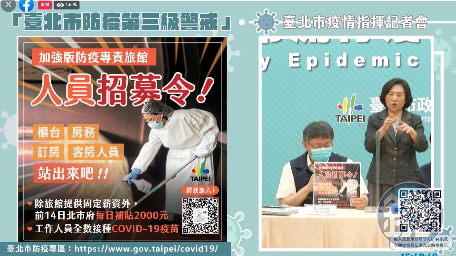 繼號召退職醫護人員後,柯文哲針對加強版防疫專責旅館,也祭出櫃台、防務、訂房及客房人員招募令!柯文哲表示,所有工作人員都會在工作首日接種武漢肺炎,除了旅館提供的固定薪資外,前14天北市府也會每天補助2,000元的危險加給。