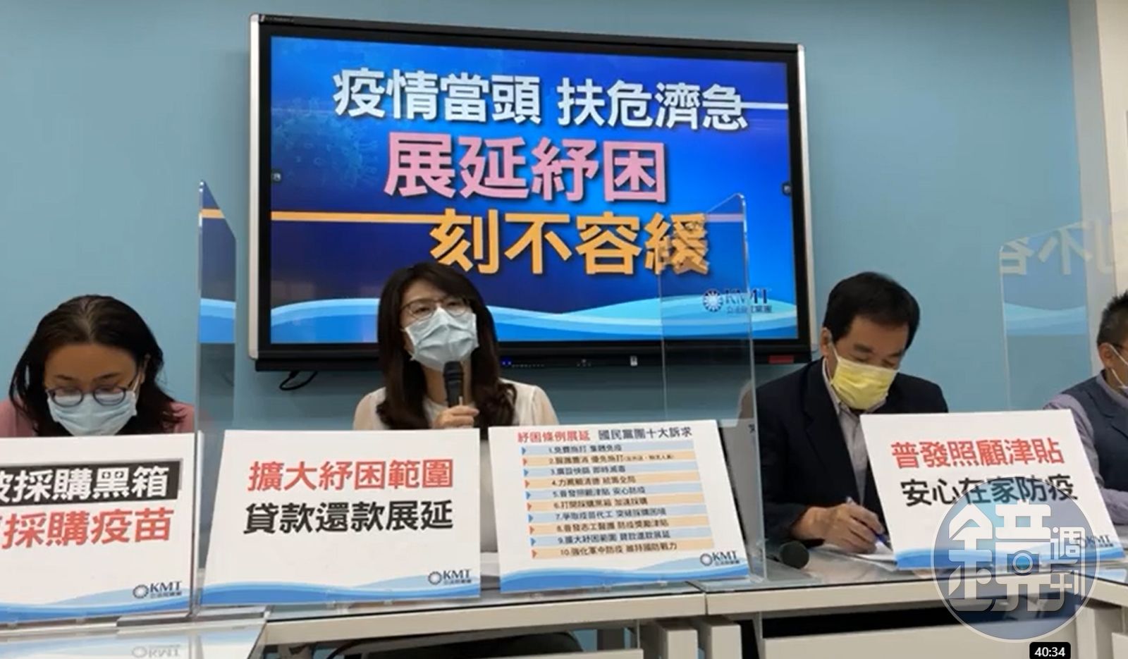 國民黨在記者會中,指出明(27日)立法院將針對《紓困條例》的展延、新的紓困預算編列及使用進行朝野協商,因此黨團提出10項訴求希望行政院能夠正視全台人民的呼聲。訴求包含:全民免費施打疫苗;醫護警消全面施打、外送及物流人員優先施打疫苗;全國廣設快篩站;力薦賴清德擔任指揮官;普發照顧津貼紓解家庭經濟壓力;打開採購疫苗黑箱並加速採購;爭取疫苗代工;針對醫護、志工發放獎勵津貼;擴大紓困範圍、貸款還款展延;以及強化軍中防疫,維持國防戰力。