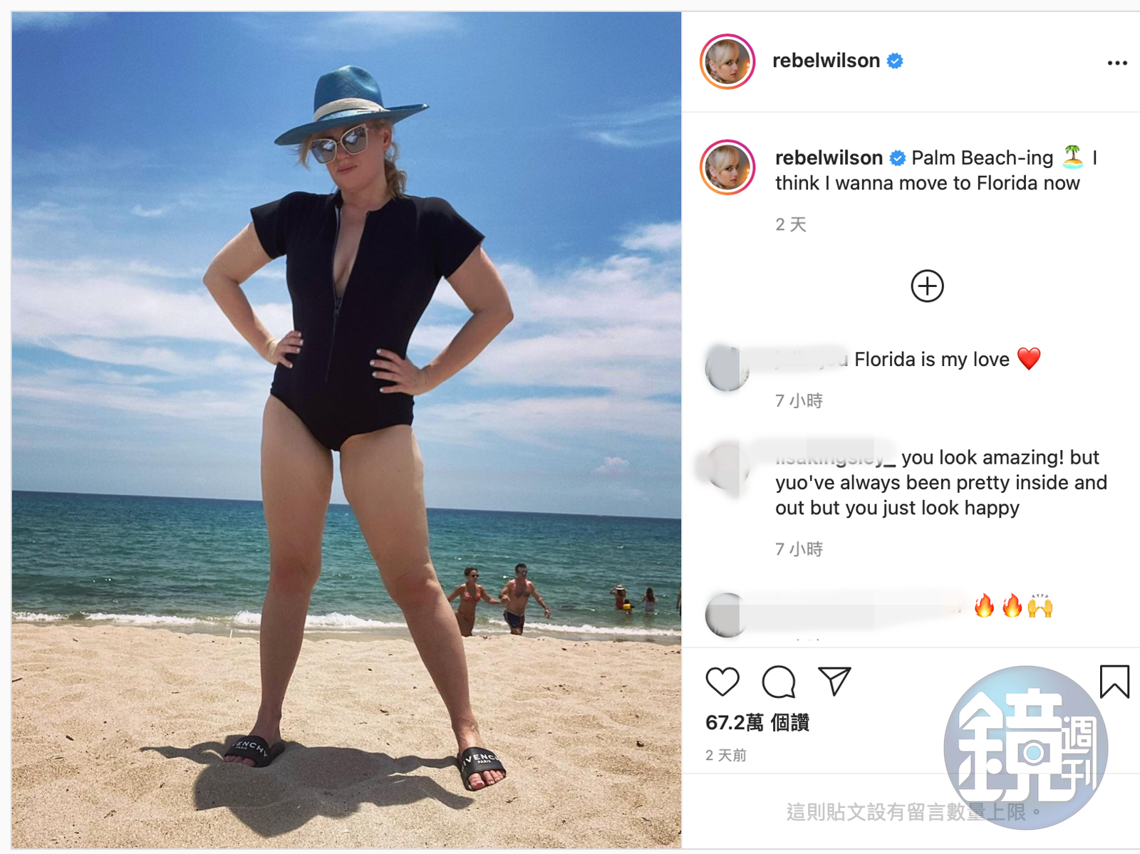 去年瘦身成功的瑞貝威爾森,不斷展現日漸窈窕的曲線,上週末也搭乘專機飛去佛羅里達州參加世界馬球活動。除了在Instagram張貼跟許多馬球選手的合照,最受矚目的就是她踩在沙灘上的泳裝照。除了遮陽帽與墨鏡,腳上的紀梵希脫鞋,當然還有穿在她身上的黑色泳裝。儘管是連身的V領設計,人人都看得出來她擁有腰身。