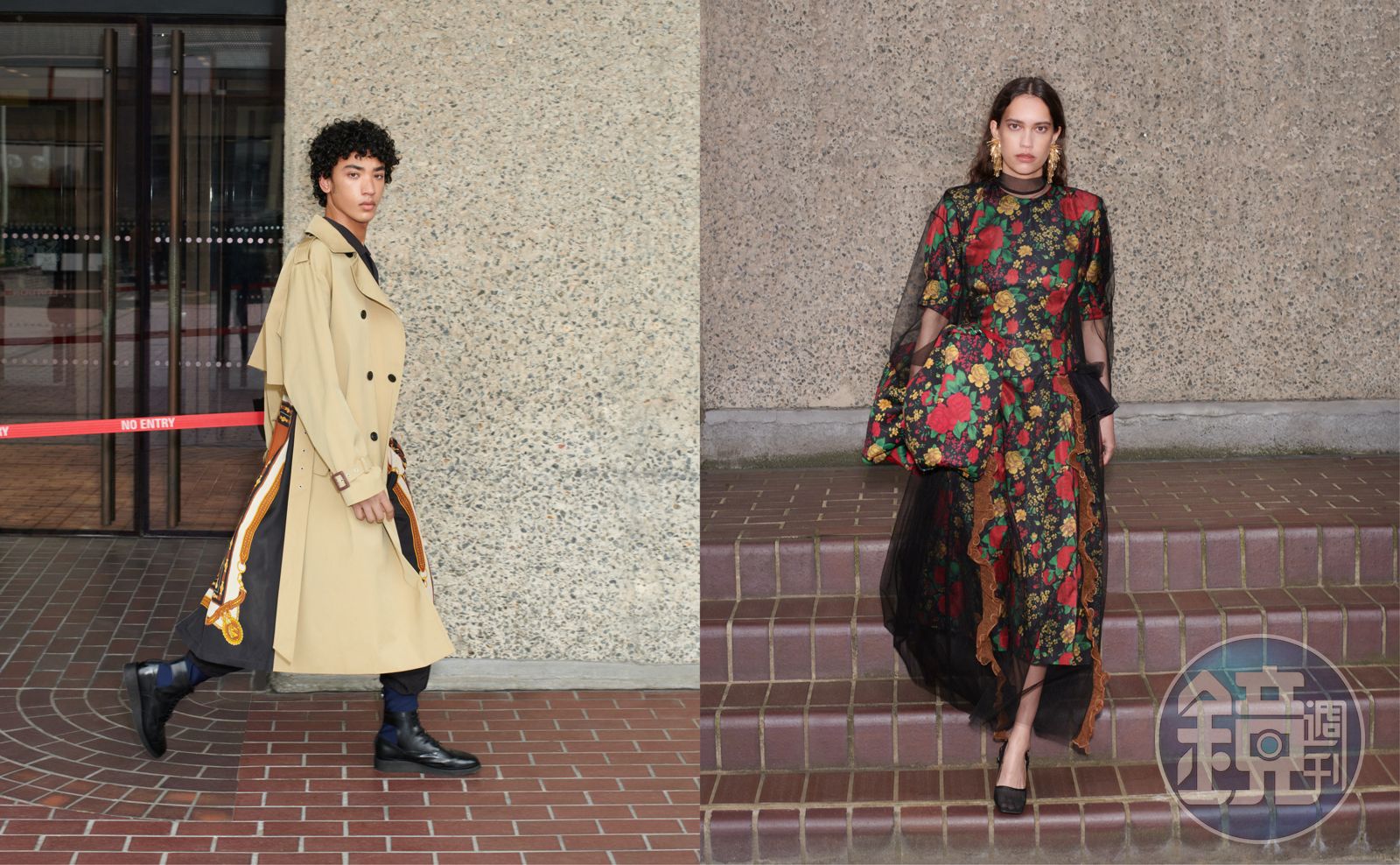 女裝方面,海軍藍、灰色和黑色的經典剪裁融合些許奇異的元素,例如珠飾口袋或絲巾、斗篷等設計細節;同時,大膽的花卉和格狀印花連身裙與解構針織衫巧妙搭配。男裝方面,醒目的印花絲巾設計融合在雙面飛行員夾克、家居服和拼接風衣之中,以及重新加工的毛衣和襯衫裡頭。