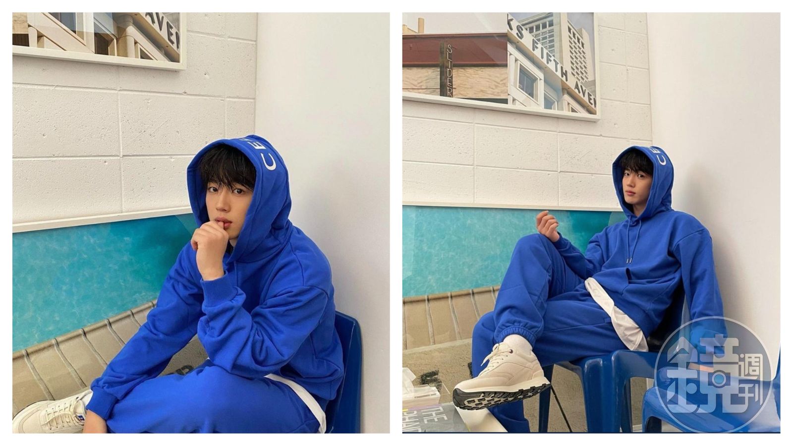 韓星金曜漢咬著大拇指穿上CELINE的成套運動服,萌樣爆表之外,運動服也給人一種草食男易親近的感覺。(CELINE提供)發布時間:2021.06.14 10:31 臺北時間
