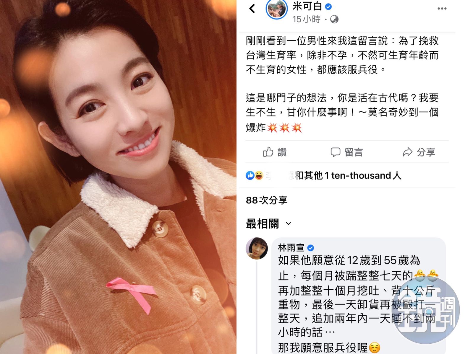 米可白近日在臉書表示,「剛剛看到一位男性來我這留言說:為了挽救台灣生育率,除非不孕,不然可生育年齡而不生育的女性,都應該服兵役。」讓她氣得大罵「這是哪門子的想法,你是活在古代嗎?我要生不生,甘你什麼事啊!~莫名其妙」。