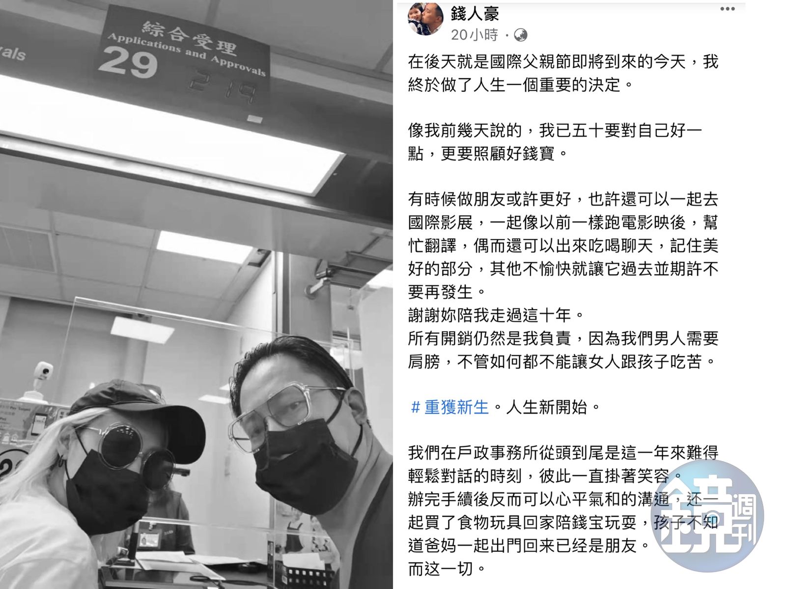 錢人豪在臉書難得貼上與老婆的合照,兩人戴上眼鏡口罩出現在戶政事務所櫃台前,一般而言通常大家都是為了辦理結婚登記才會一起在櫃檯前合影,但他們卻是為了辦理離婚登記。錢人豪表示自己終於做了人生一個重要的決定,他認為與前妻有時候做朋友或許更好,希望兩人能記住美好的部分,不愉快的就讓它過去並期許不要再發生,最後更以「重獲新生」來形容離婚這個決定。