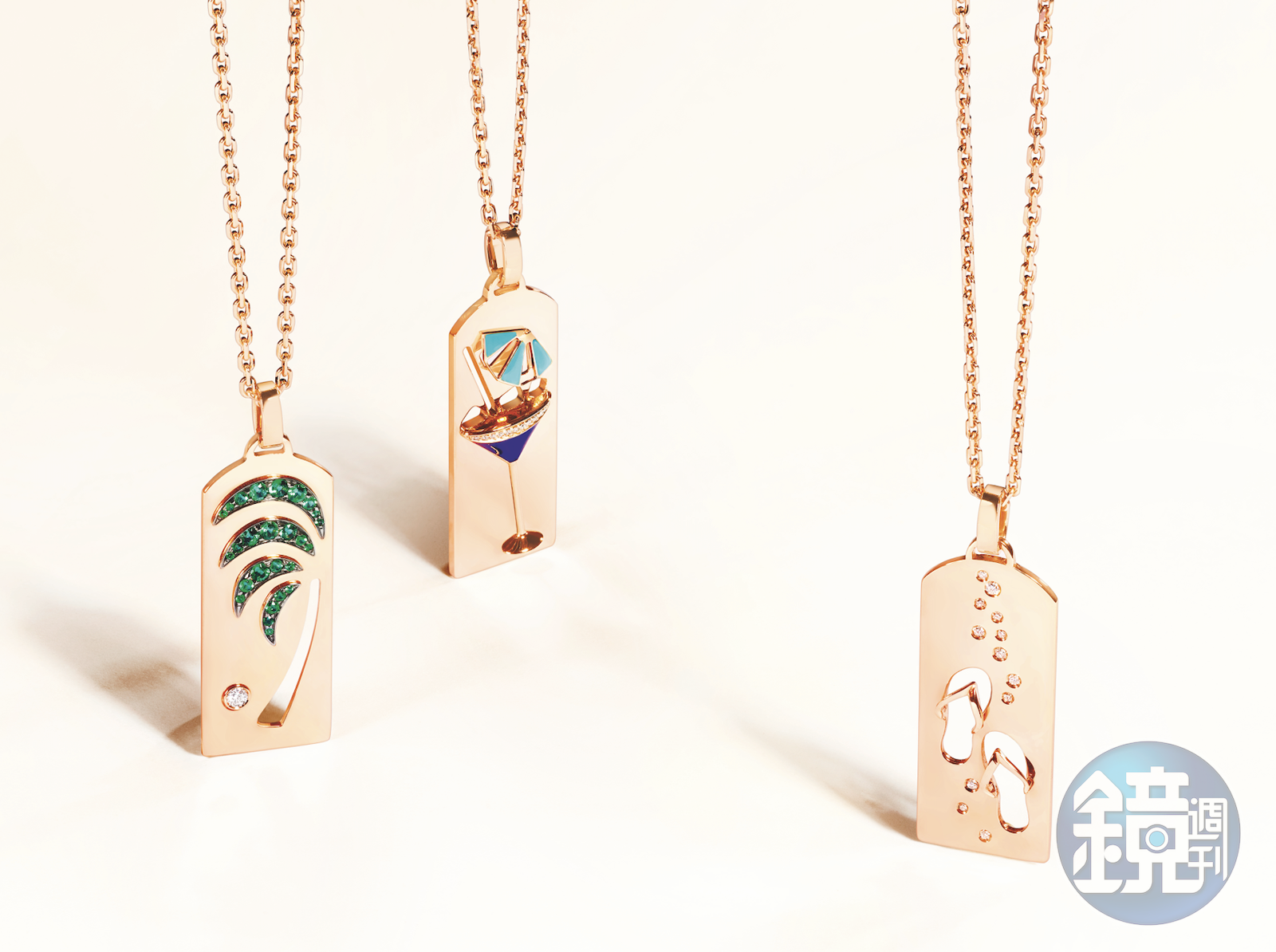 雞尾酒鑽飾黃金鍊墜 NT$282,700 FRED。(FRED提供)全新Riviera鍊墜系列,以玫瑰金及黃金吊墜打造,妝點飾有法國里維埃拉(Riviera)的生活靈感主題,將創辦人Fred Samuel真正的風采和幽默融於其中,精巧的鏤空設計包括一棵棕櫚樹,一雙人字拖鞋,甚至一杯雞尾酒圖樣皆鑲有寶石於其中,這些充滿熱帶風情的元素,就算無法去海邊,也能感受到海風吹拂的氣息。