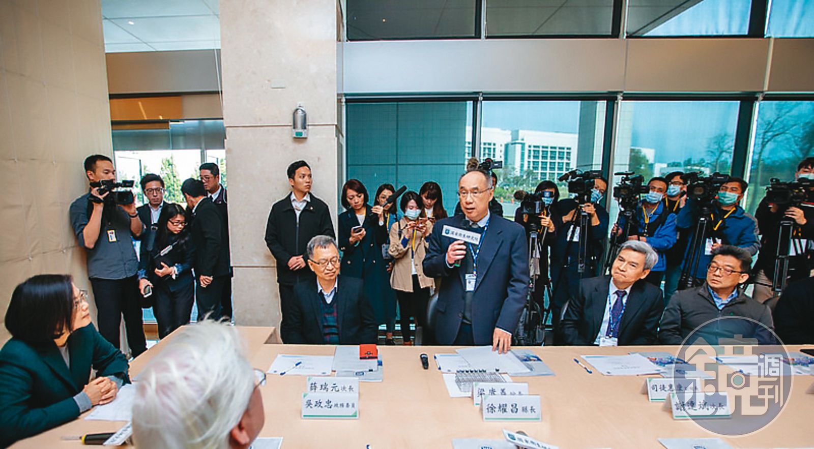 身兼指揮中心研發組長的梁賡義(右3)向蔡英文(左1)等高層建議,須建立mRNA疫苗技術平台。圖為蔡英文去年2月視導國衛院畫面。(總統府提供)發布時間:2021.06.29 05:58 臺北時間