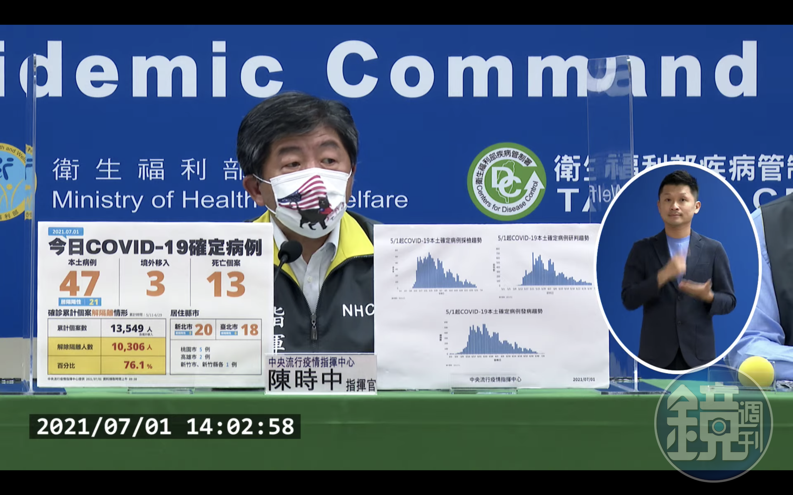指揮中心說明,今日新增13例死亡個案,為7例男性、6例女性,年齡介於50多歲至80多歲,發病日介於5月14日至6月18日,確診日介於5月18日至6月20日,死亡日介於6月17日至6月30日件。指揮中心公布的死亡個案資訊中,13人皆有慢性病史,3人因為其他因素住院,其中1例80多歲女性案14010住院約8天就不幸病逝。