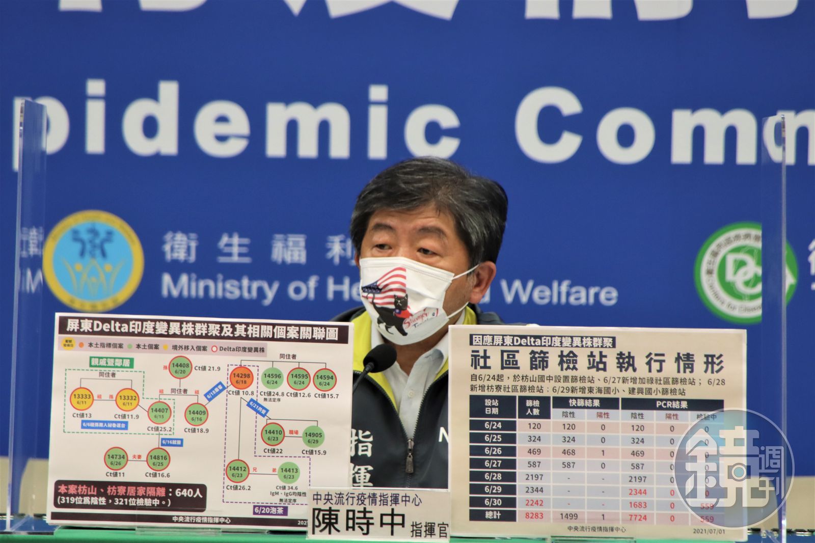 針對屏東印度變異株(Delta病毒)群聚案,陳時中直指,屏東群聚個案沒有向外擴張,雖昨(6月30日)新增1名案14905,但其是已被匡列曾與指標個案司機的共餐接觸者。根據指揮中心公布數據顯示,屏東群聚案截至今日為止,包含秘魯返台祖孫、白牌車司機與其家人、共餐者、司機乘客與同住者,以及感染源待釐清曾至枋寮醫院的果農夫婦等15人。