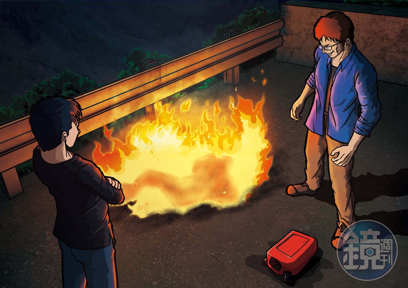 之後,何與林將車開到預定釋放人質的地點,但劉男已死,為了滅證,2人於是從車內取出汽油、甲苯,潑在劉身上點火焚屍,最後將屍體推落山谷。警方押解2人前往棄屍地點,何指著70公尺深的山谷說:「就丟在那裡!」因坡度陡峭,警方動員搜救隊,才在谷底找到被燒得面目全非、腹部爆開的屍體。
