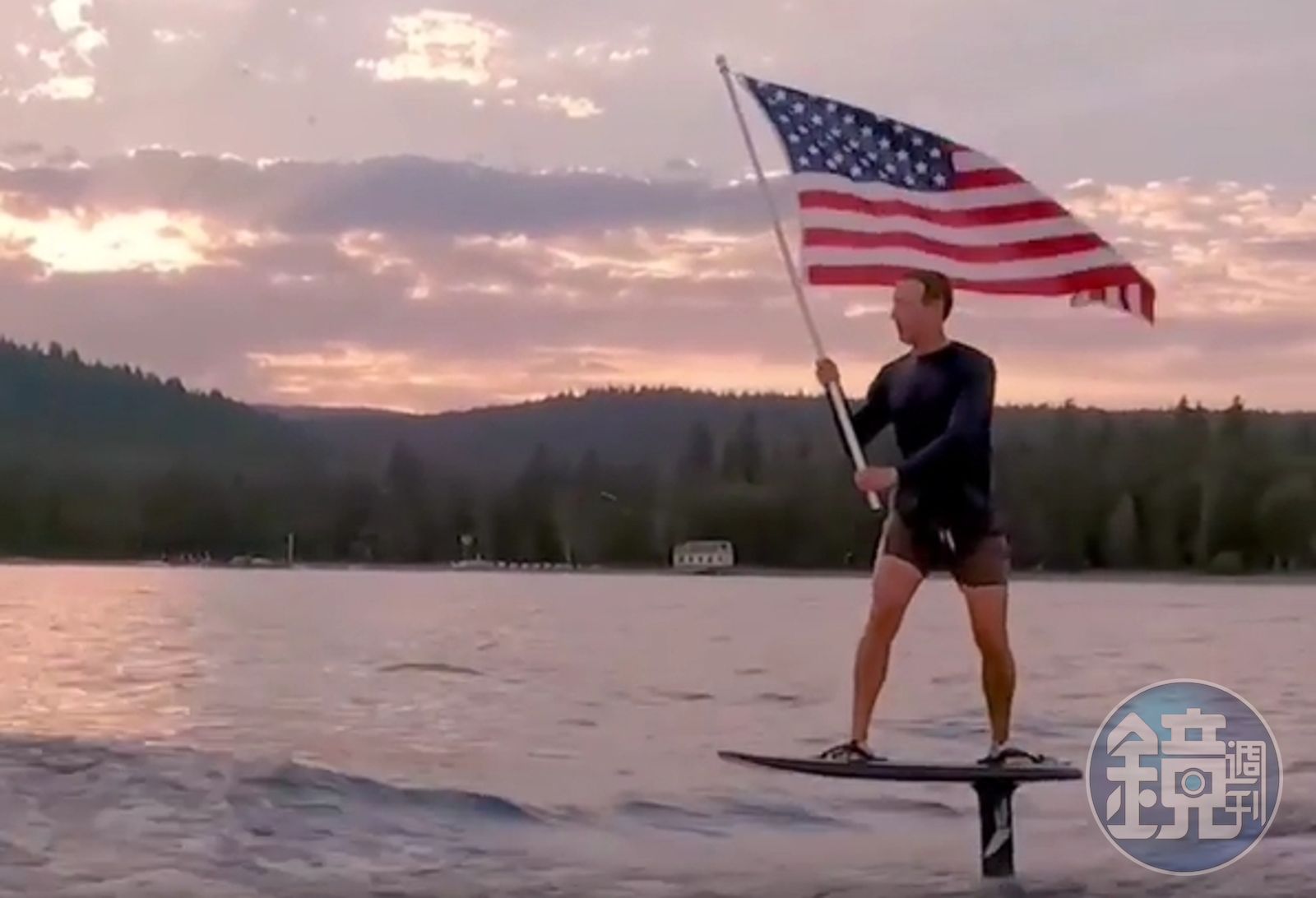 慶祝美國國慶日到來,臉書創辦人馬克·祖克柏(Mark Zuckerberg)昨(5日)上傳了一支揮舞國旗、乘風破浪在水上飆速的驚奇片段,影片中的他頂著日落餘暉,在山林環繞的湖畔中,腳踩看似電動衝浪板的神秘黑科技,神情激動地高速行駛,搭配著美國鄉村歌王約翰丹佛(John Denver)的名曲《Take Me Home, Country Roads》,奇妙景象令全球網友無不嘖嘖稱奇,至今也已吸引近2百萬人湧入按讚。