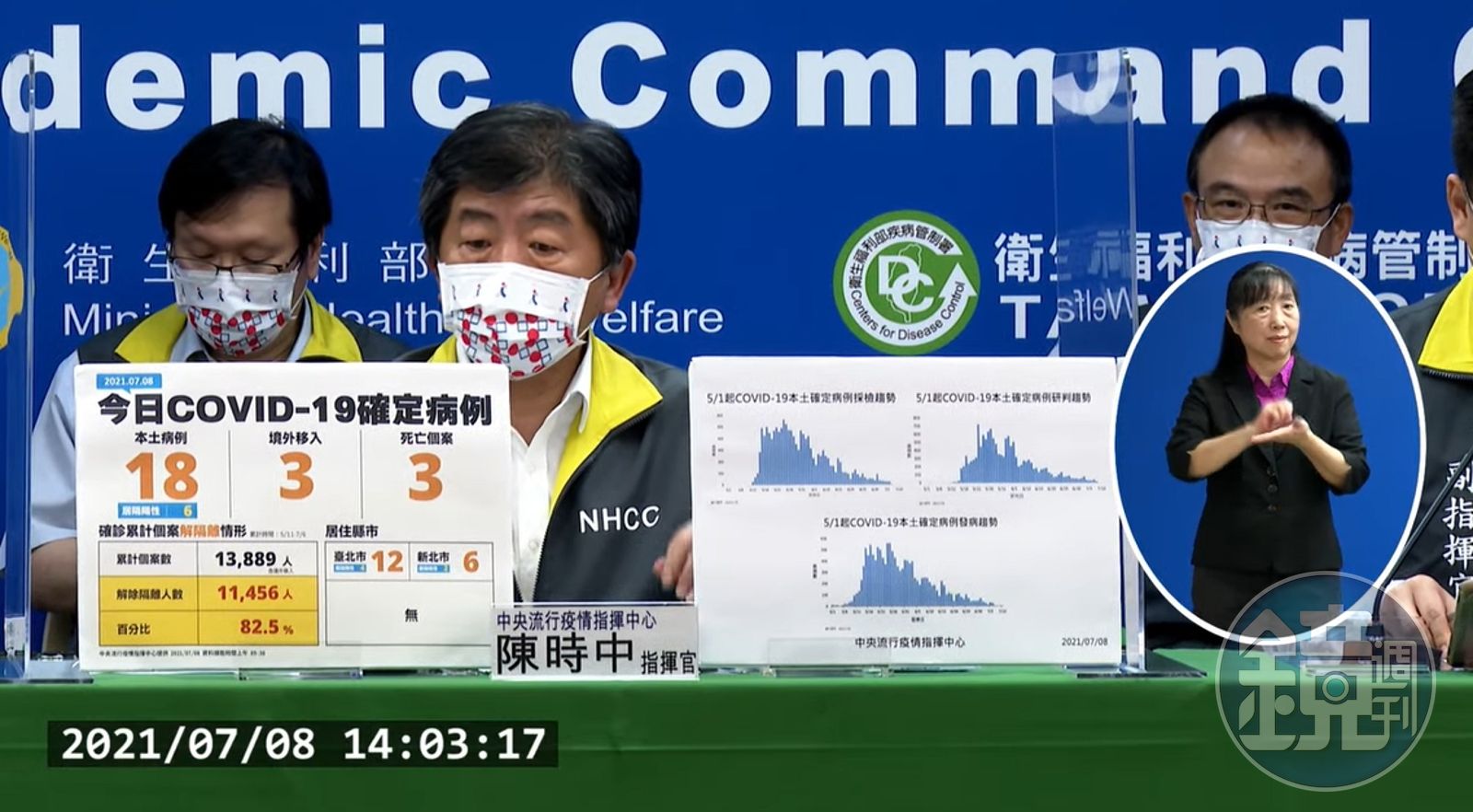 指揮中心表示,今日新增之18例本土病例(其中6例為居家隔離期間或期滿檢驗陽性者),為8例男性、10例女性,年齡介於未滿5歲至60多歲,發病日介於今年7月1日至7月7日。個案分布以台北市12例最多,其次為新北市6例;其中9例為已知感染源、9例調查中,相關疫情調查持續進行中。