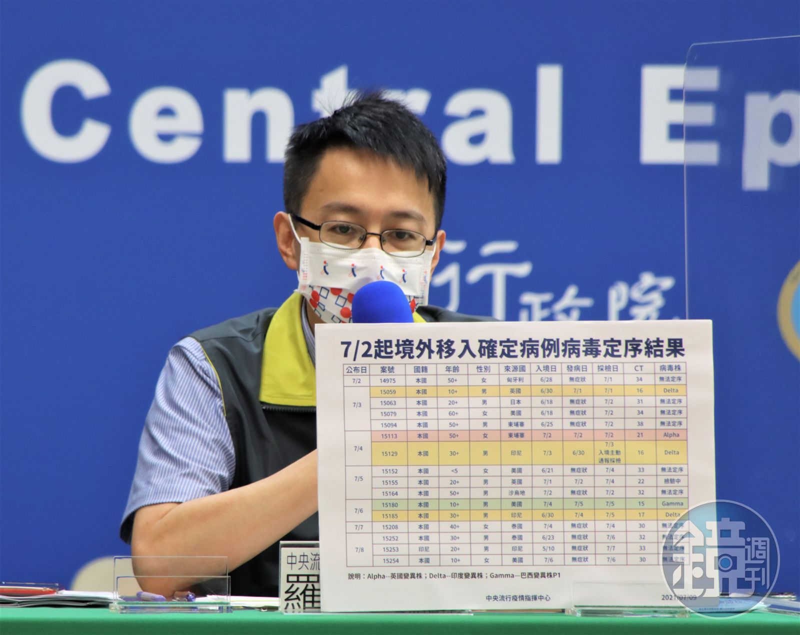 羅一鈞在今日記者會上說明,近一週境外移入個案基因定序結果。(指揮中心提供)發布時間:2021.07.09 15:03 臺北時間