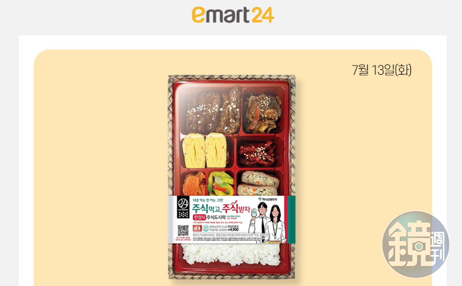 南韓連鎖超商Emart24與韓亞金融集團合作,推出「股票便當」,引發熱議。(翻攝自Emart24臉書)