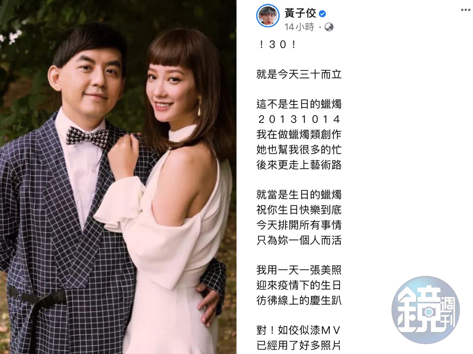 就在愛妻孟耿如踏入三十而立之年,黃子佼率先表達對她的祝福,他表示:「祝你生日快樂到底,今天排開所有事情,只為妳一個人而活。我用一天一張美照,迎來疫情下的生日,彷彿線上的慶生趴,對!如佼似漆MV已經用了好多照片,仍有許多美圖未用,我是她專屬攝影師,日日夜夜累積回憶,我會挑不需修圖的,也不裁圖直接貼出,呈現最真實的紀錄。」