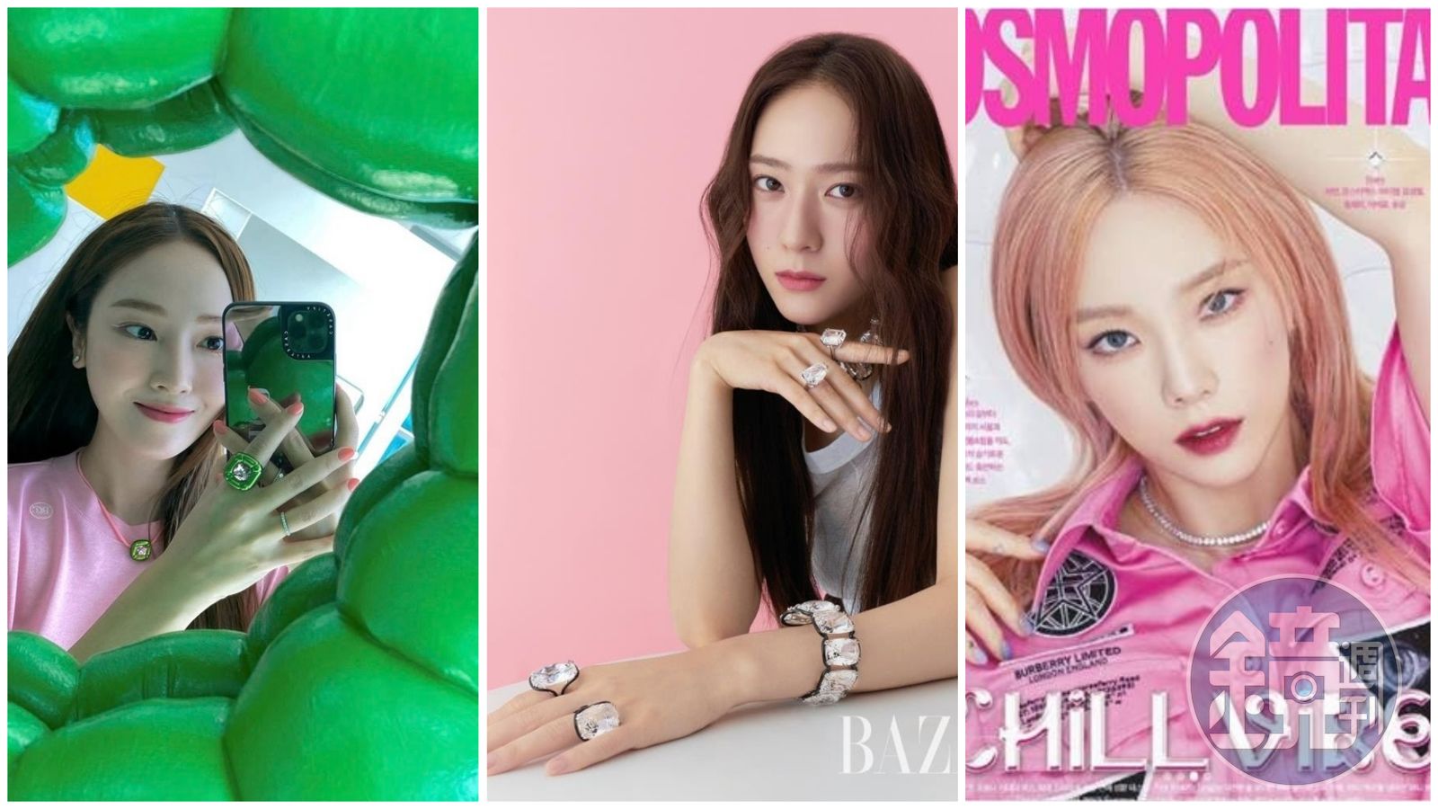 Jessica、Krystal與太妍三人無論是拍攝雜誌,或是在IG上都能見到SWAROVSKI的蹤跡。(左起:翻攝自Jessica IG、翻攝自《Harper’s BAZAAR》IG、翻攝自IG帳號 taeyeon_ss)發布時間:2021.07.28 15:16 臺北時間
