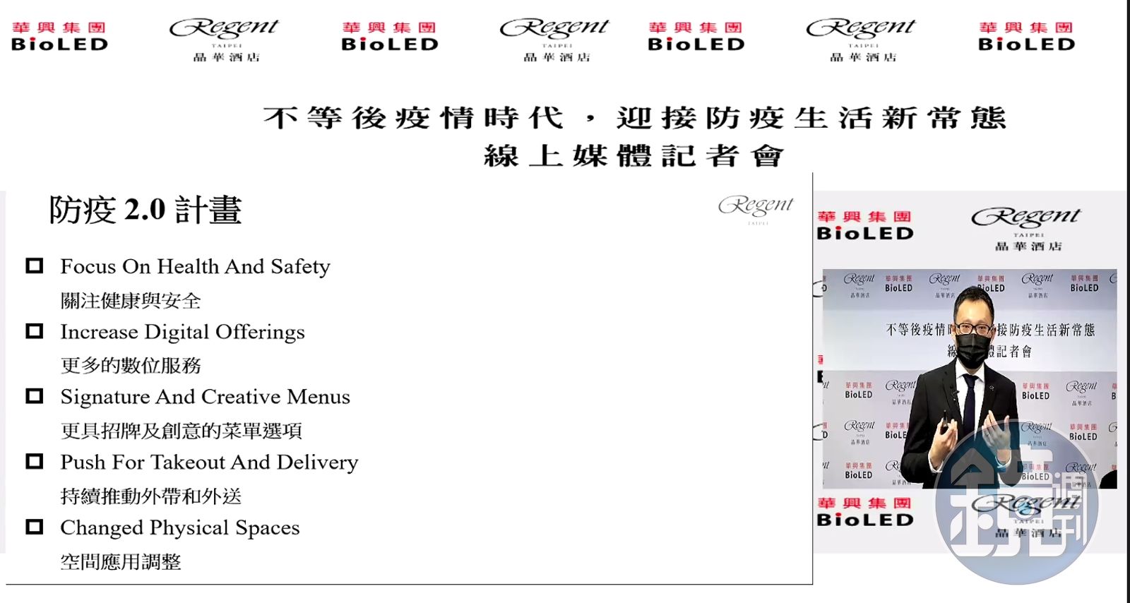 晶華的防疫2.0計畫,除比照防疫旅館的SOP,增加客房、餐廳與公共區域的消毒清潔頻率,並全面執行消費「實聯制」與餐點「實名制」,外帶餐點皆附有「安心小卡」,詳實記錄餐點製作時間與食用建議,烹調廚師與打包人員皆簽名以示負責,為消費者的飲食安全層層把關。