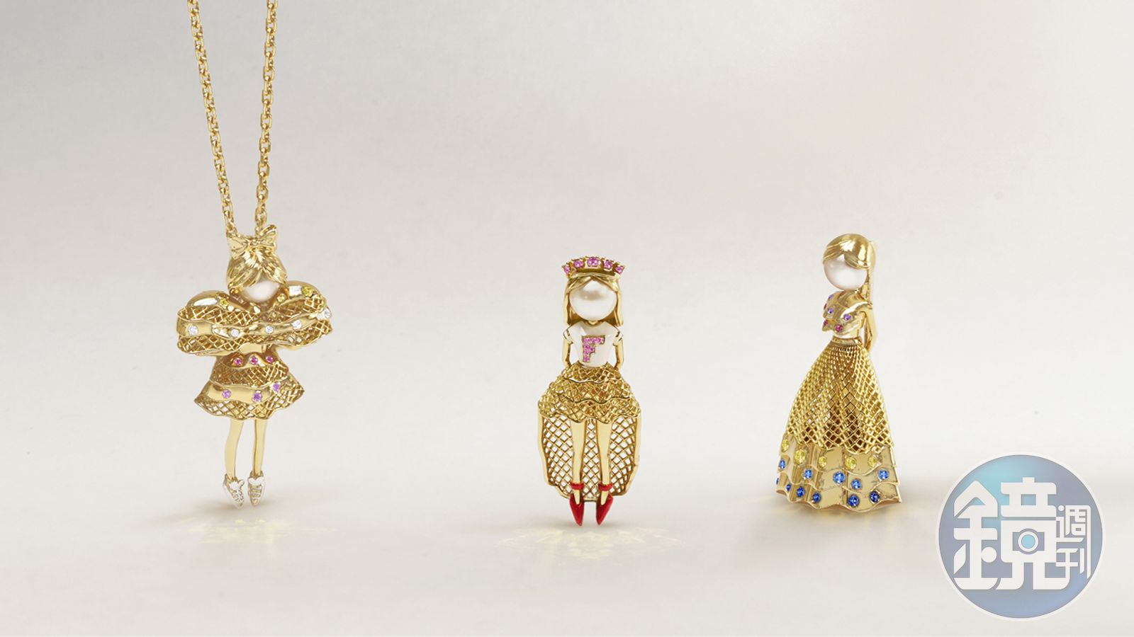 Fredy's Tomo's Dolls FROU-FROU吊墜+項鍊。NT$491,700(FRED提供)這3尊珠寶小人偶從小泉智貴的3件經典禮服中汲取靈感,以身上的衣服造型分別命名為 FROU-FROU、CHOUCHOU和TUTU,FRED的珠寶工匠們則搖身一變,成為服裝設計師:霧金或亮金色的裙子、實心或網狀鏤空設計,各種不對稱的形狀和尺寸,上衣和荷葉邊鑲嵌著紅寶石、鑽石和藍寶石,再增添粉色、紫色、黃色、藍色、綠色、紅色或白色的漆面細節。小泉智貴說:「我希望珠寶小人偶能夠一直陪伴著顧客,成為時尚造型中的一大亮點。」