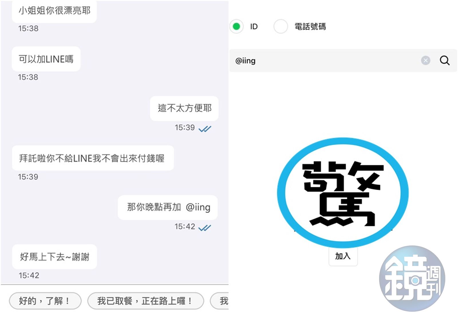 從圖片中可見,對方寫下「小姐姐你很漂亮耶,可以加LINE嗎?」原PO婉拒「這不太方便」,但對方繼續死纏爛打地說「拜託啦!你不給LINE我不會出來付錢喔!」最後,她只好給了一個「@iing」的ID帳號,並提醒對方「那你晚點再加」,而其實這個ID帳號是總統蔡英文的LINE。原PO透露,幸好當下對方沒發現,並提醒女外送員們,「以後遇到這種狀況就隨便給一個ID知道嗎?不要傻傻真的把個資給出去,太危險了,希望他跟總統聊得開心」。