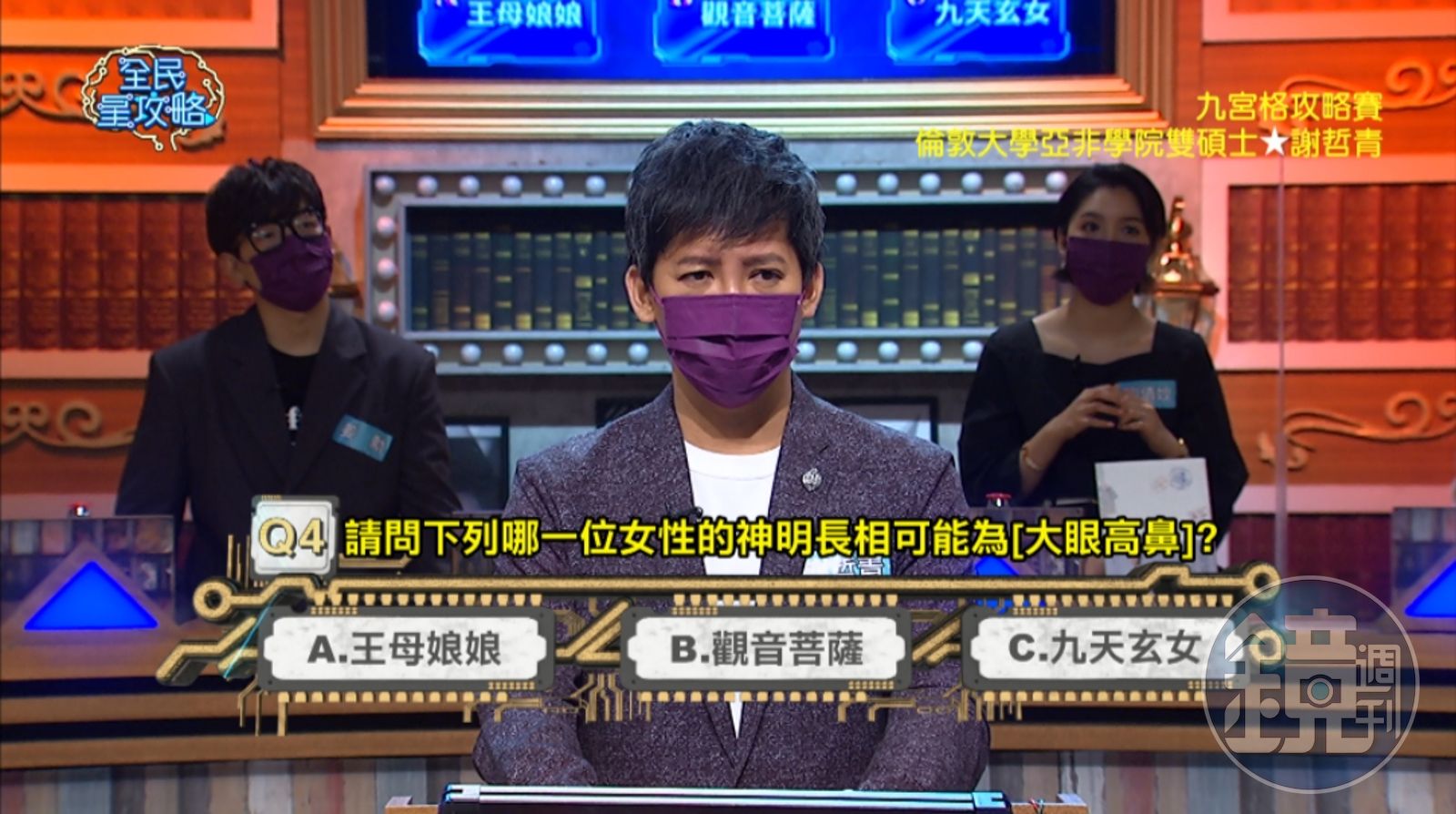 走遍世界各地的謝哲青,不僅飽讀書中各種知識,腦袋裡更裝滿他多年來行萬里路所獲得的學問。這次他面對製作單位替他量身訂做的第5套攻略題,一樣不假思索的作答,每個答案都能說明的頭頭是道,就連哪位女性神明的長相可能是大眼高鼻,他都能說個明白,讓一旁負責解說的蔡尚樺傻眼直呼:「要不要讓人活啊!」還可愛的抱怨說:「只要遇到他的題目我都不看解釋,反正他都會說明。」曾國城則是兩手一攤,無奈笑回:「他解釋清楚妳要替他高興才是!」