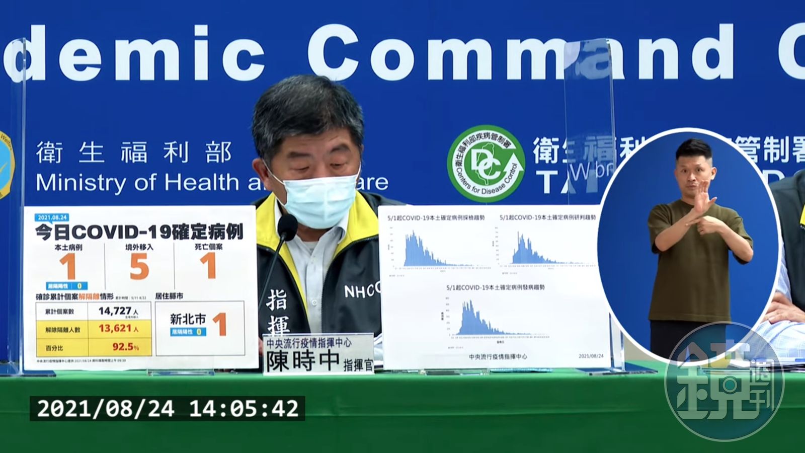指揮中心指出,近期確診個案解隔離情形,5月11日至8月22日累計公布14,727位確診個案中,已有13,621人解除隔離,解隔離人數達確診人數92.5%。