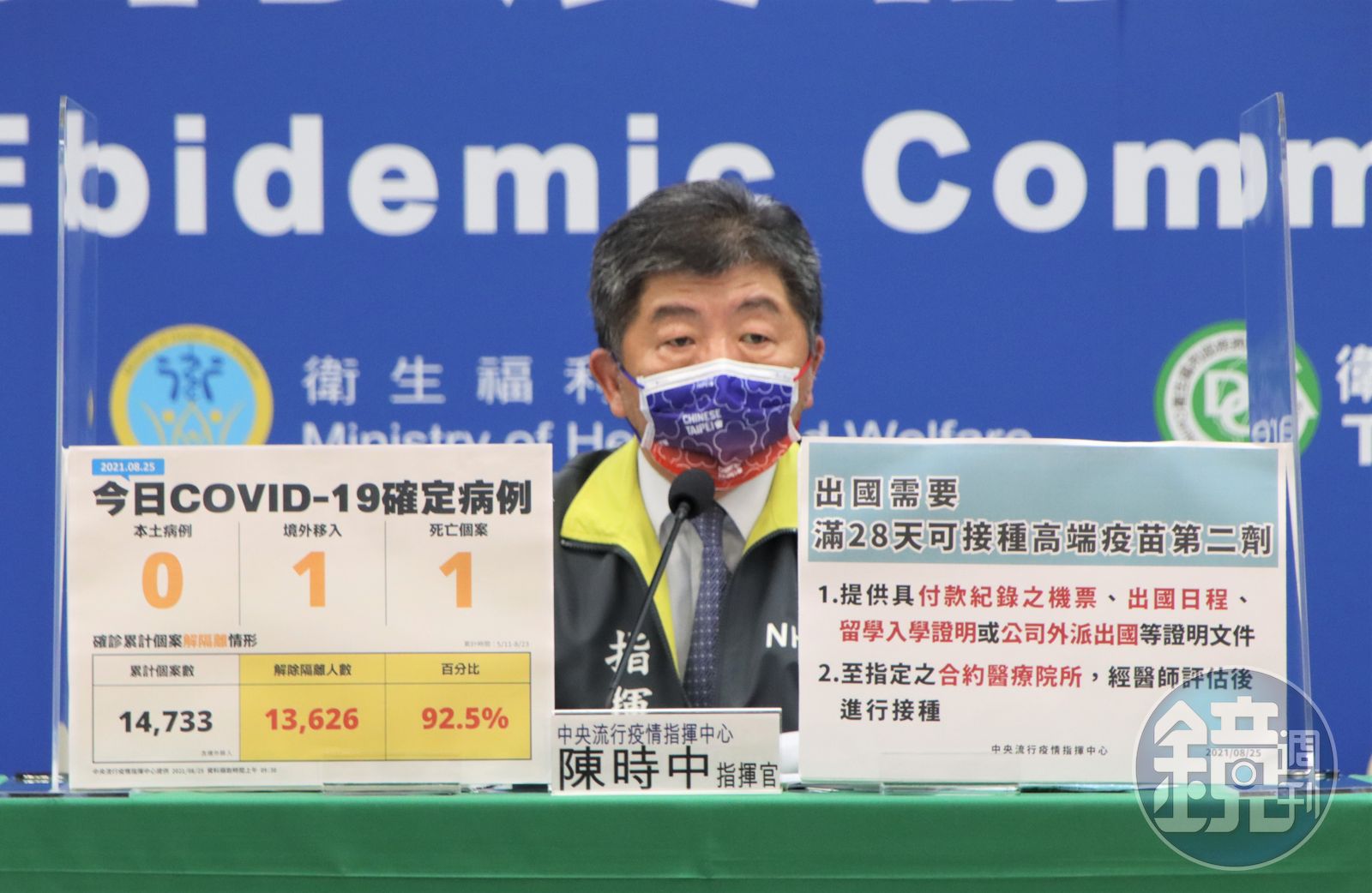 另外,第一批國產高端疫苗在23日開打,指揮中心今日宣布,在8月23日至29日完成第一劑接種之民眾,預計在9月27日提供接種第二劑,屆時符合預約資格或收到簡訊提醒者即可預約接種,若有出國急迫性須於第一劑後滿28天接種者,請地方政府衛生局指定轄內合約醫療院所於預約平台開打(9月27日)前酌情提供接種。