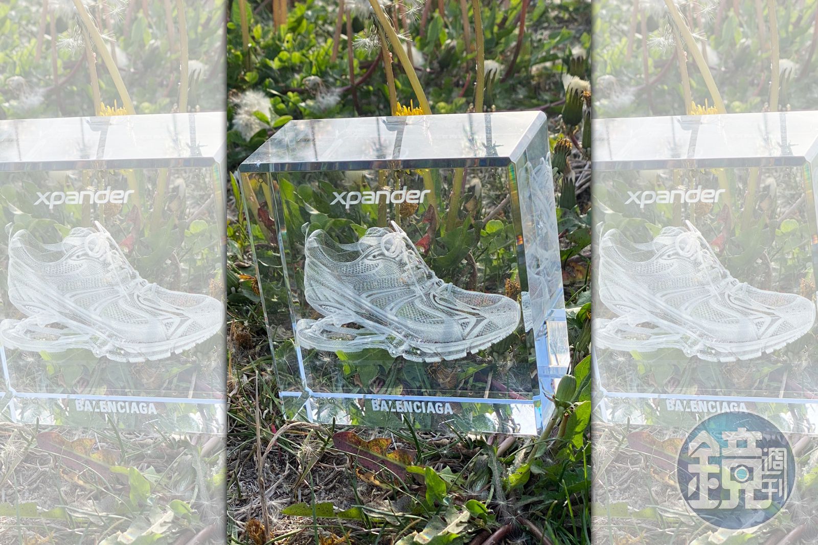 Laser Cube雷射立方Triple S。NT$21,100,台北微風信義店限定販售。(BALENCIAGA 提供)這是一款營造錯視效果的玻璃雕刻藝術作品。雷射立方推出包含Triple S、Track、Tyrex與X-Pander運動鞋等多個版本,藉由數以千計的蝕刻點,再現各款運動鞋的繁複細節。每只運動鞋以半透明的形式或全像投影般懸浮在玻璃中,3D圖像的上方及下方,還分別刻有運動鞋名稱和Balenciaga品牌標識。