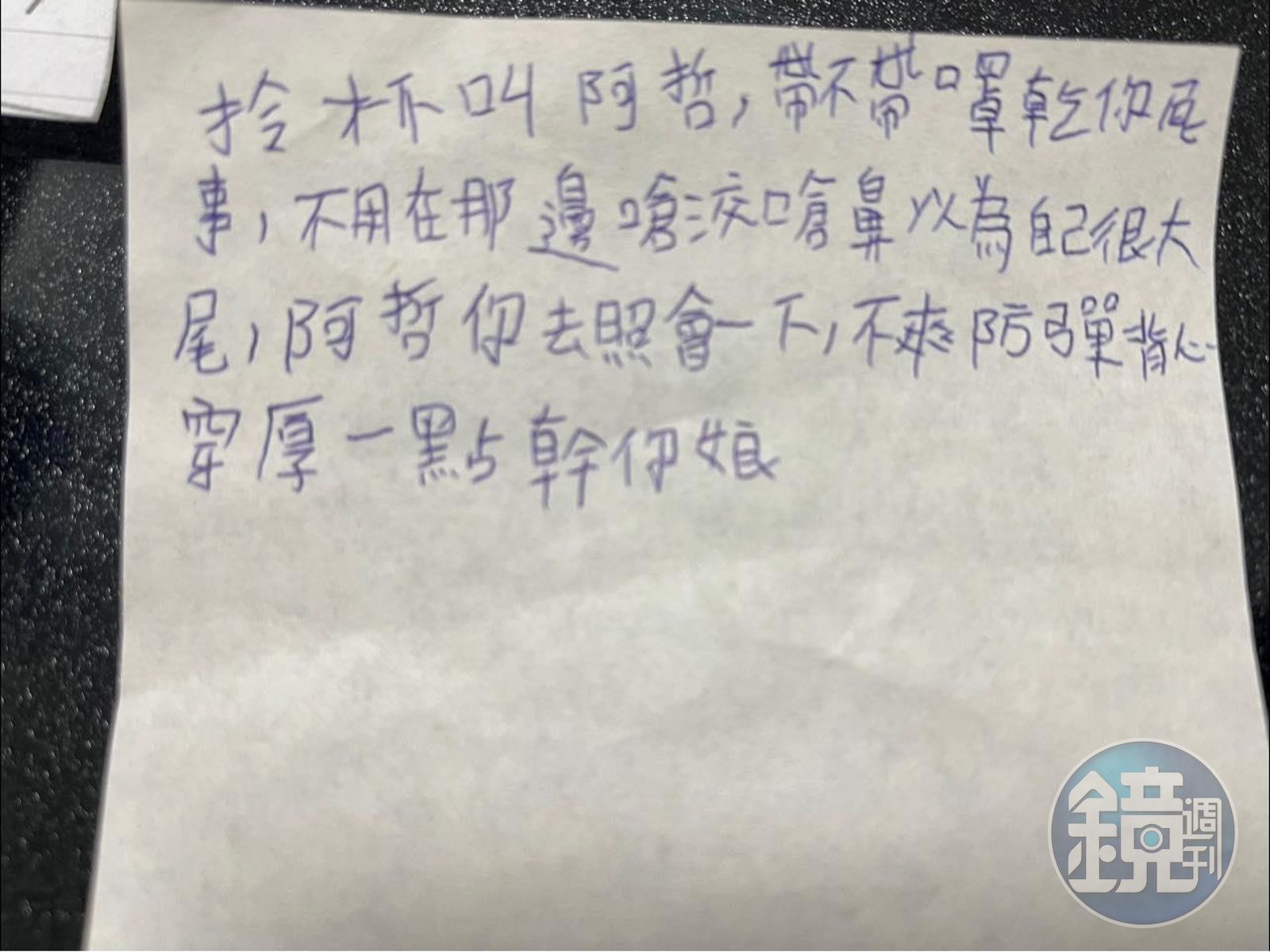 紙條上頭則寫著:「拎杯叫阿哲,帶(戴)不帶(戴)口罩乾(干)你屁事,不用在那邊嗆洨嗆鼻,以為自己很大尾,阿哲你去照會一下,不爽防彈背心穿厚一點,幹X娘!」因字跡相當潦草,且文中錯字連篇,粗俗而不明就裡的嗆聲,也引起網友一陣訕笑,事件經網路發酵後,「阿哲」似乎耍狠失利,反倒成了網友的笑柄。