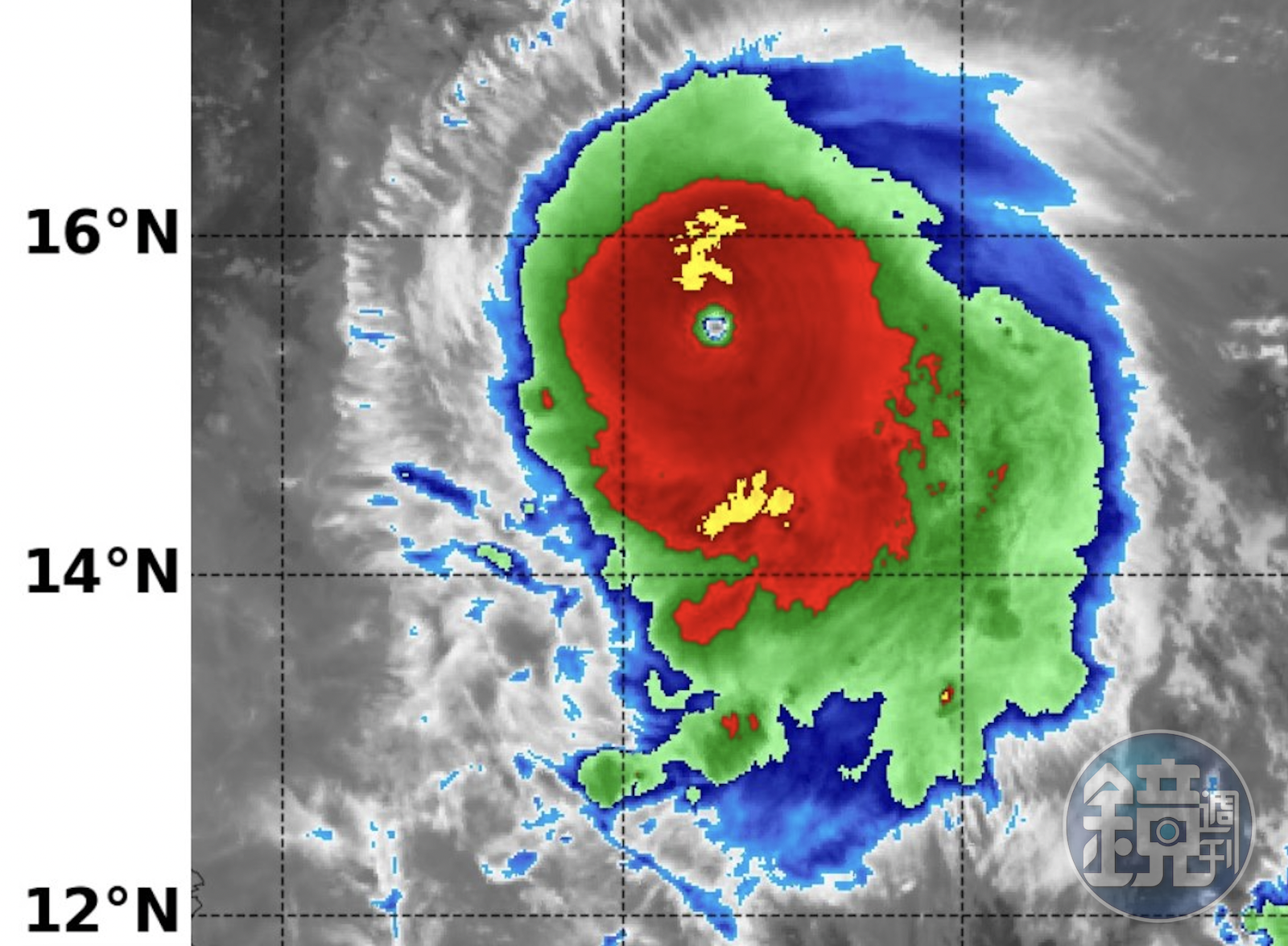 鄭明典在臉書上表示,第14號颱風璨樹,「眼牆雲系均勻環繞,雲頂溫度是紅色帶黑的低溫,颱風眼藍色以上高溫」,這是強烈颱風的特徵,鄭明典接著說,從衛星雲圖中,若眼牆溫度為完整黃色環繞,那就是衛星判讀裡最強等級的強烈颱風,而璨樹的強度相當接近。