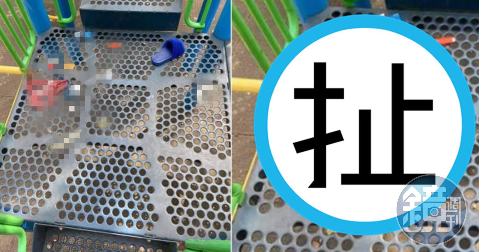 該名男網友在「爆廢2公社」分享一張照片,照片可見地點是在公園的兒童滑梯架上,但離譜的是上面被丟了一堆垃圾,竟然有滿地的保險套封膜、六個使用過的保險套、女用內褲、還有一隻毛絨拖鞋。