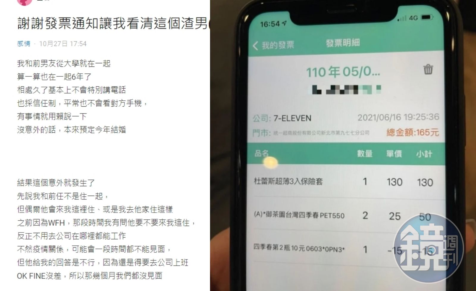 等到8月疫情降溫,全國降回二級警戒,2人終於再度碰面,某天男方到她家找她,她用對方手機追劇,此時突然跳出一則發票App的通知,她不小心誤觸點開了App後,突然好奇想看一下男友平常都買些什麼,「不看還好,一看不得了,明明5-7月都沒見面,竟然會有買保險套的發票」,讓她氣到手抖,一邊還不忘要拍照存證。