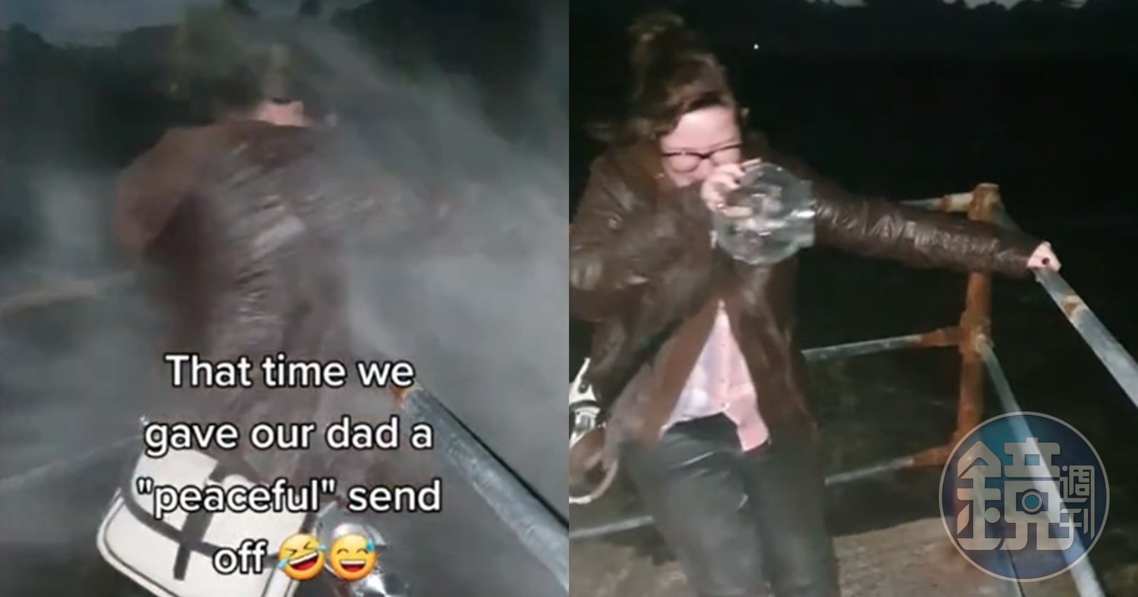 未料,正當泰拉將骨灰往海裡倒時,突然颳起一陣強風,把骨灰全吹回她身上,泰拉瞬間被壟罩在骨灰中,姊妹倆當場傻眼,但2人隨後開始大笑,還邊笑邊喊道「他(爸爸)跑到我嘴裡了!」