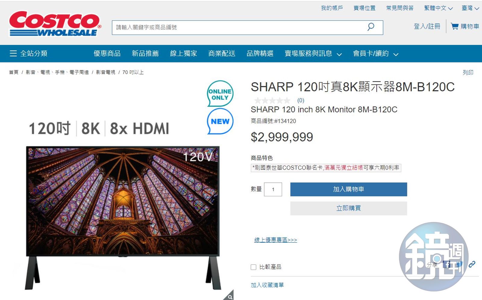 一名男網友在臉書《Costco好市多 商品經驗老實說》表示,自己近日滑好市多官網時,發現有一台夏普電視「120吋真8K顯示器」,售價竟要299萬9,999元,而且還能刷卡分6期零利率,讓他驚呼連連。
