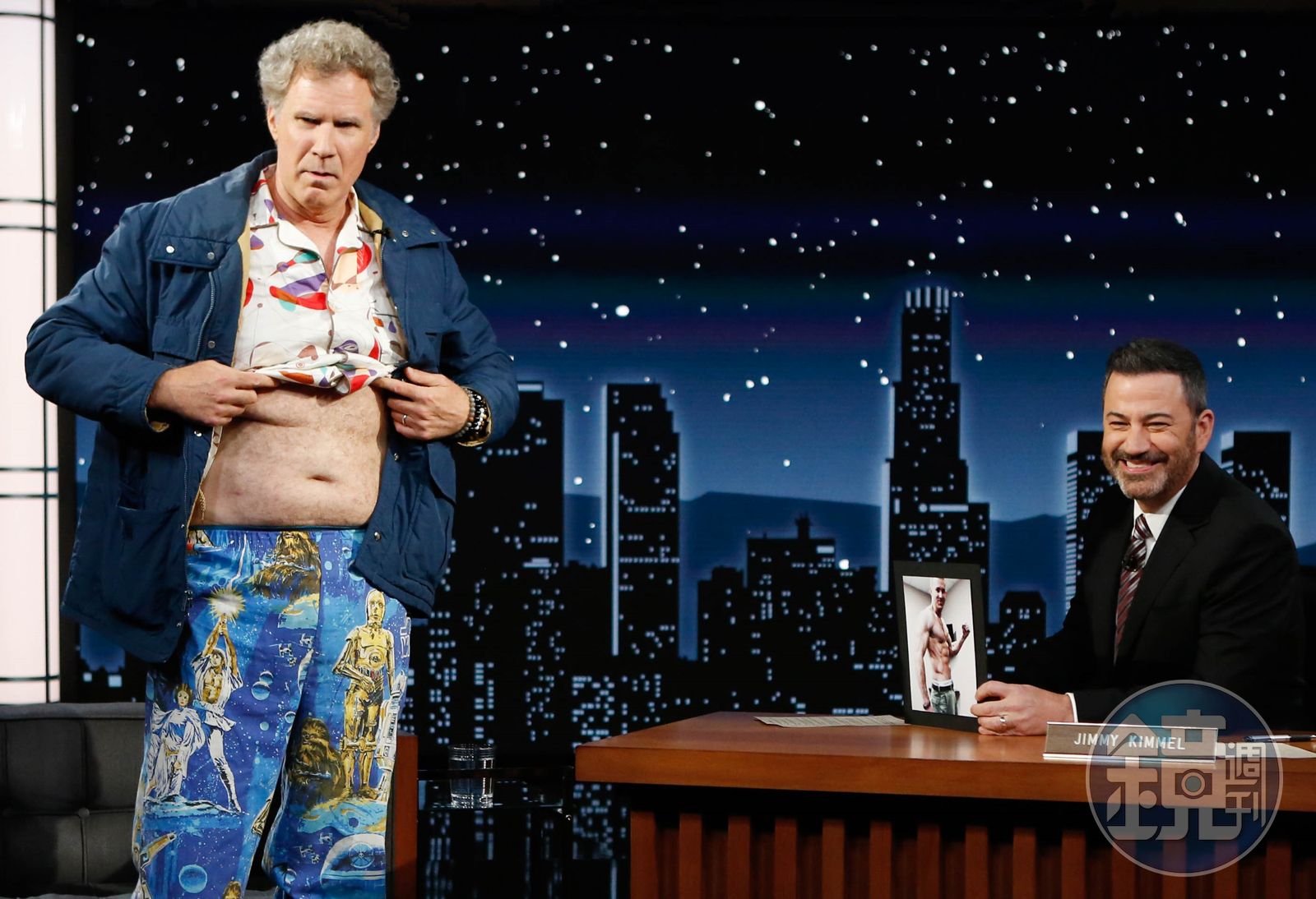 同時間在洛杉磯開錄的《吉米基墨脫口秀》(Jimmy Kimmel Live),主持人吉米基墨歡迎當晚的嘉賓是萊恩雷諾斯,結果走出來的卻是威爾法洛。威爾的理由也是受萊恩所託,「他寫簡訊給我,遲到了,要我幫忙代打宣傳。」接著強迫吉米要訪問他關於電影《紅色通緝令》(Red Notice)的問題。主持人反問,難道你有演這部片嗎?「沒有,我一眼也沒看過。」於是接下來的訪問就只好把威爾當成萊恩做,想也知道就是雞同鴨講,所以當主持人拿出萊恩雷諾斯的大露腹肌的照片,要求威爾也照辦時,結果就變成了身材走鐘秀。
