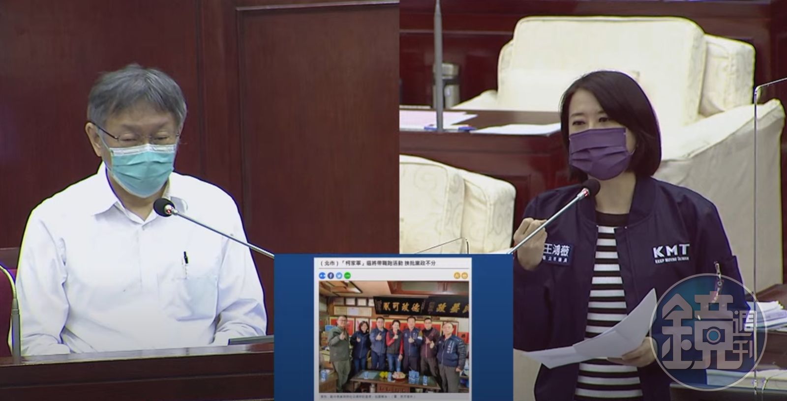 市議員王鴻薇(右)質疑黃瀞瑩利用行政資源拚選舉,市長柯文哲(左)回應強調,黃瀞瑩現在沒有在當副發言人了。(翻攝自台北市議會YouTube頻道)發布時間:2021.11.19 16:23 臺北時間