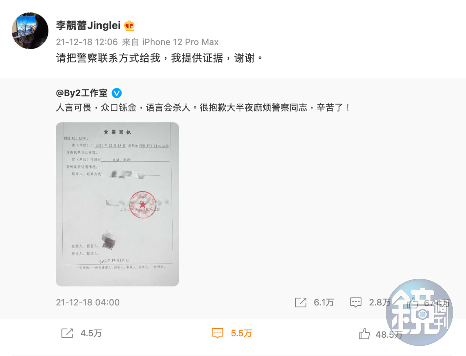 但沒想到李靚蕾竟然也在18日中午12點轉發了這條微博發文,還加上「請把警察聯繫方式給我,我提供證據,謝謝。」徹底跟Yumi槓上,瞬間獲得67萬個讚。大家都想知道,究竟提供的證據是有利於Yumi被網友抹黑污衊,還是有利於李靚蕾婚變的真相,事情演變至此已經完全進入超展開的局面。