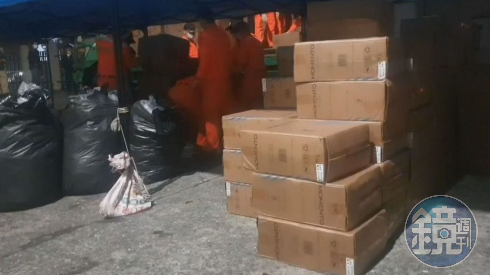 漁船「海獵人號」停靠港邊,四周拉起了封鎖線,海巡署台北查緝隊上船查驗,當場起出超過4百箱走私菸。一箱箱私菸堆滿港邊,一直到晚上6點多才終於清點完畢。