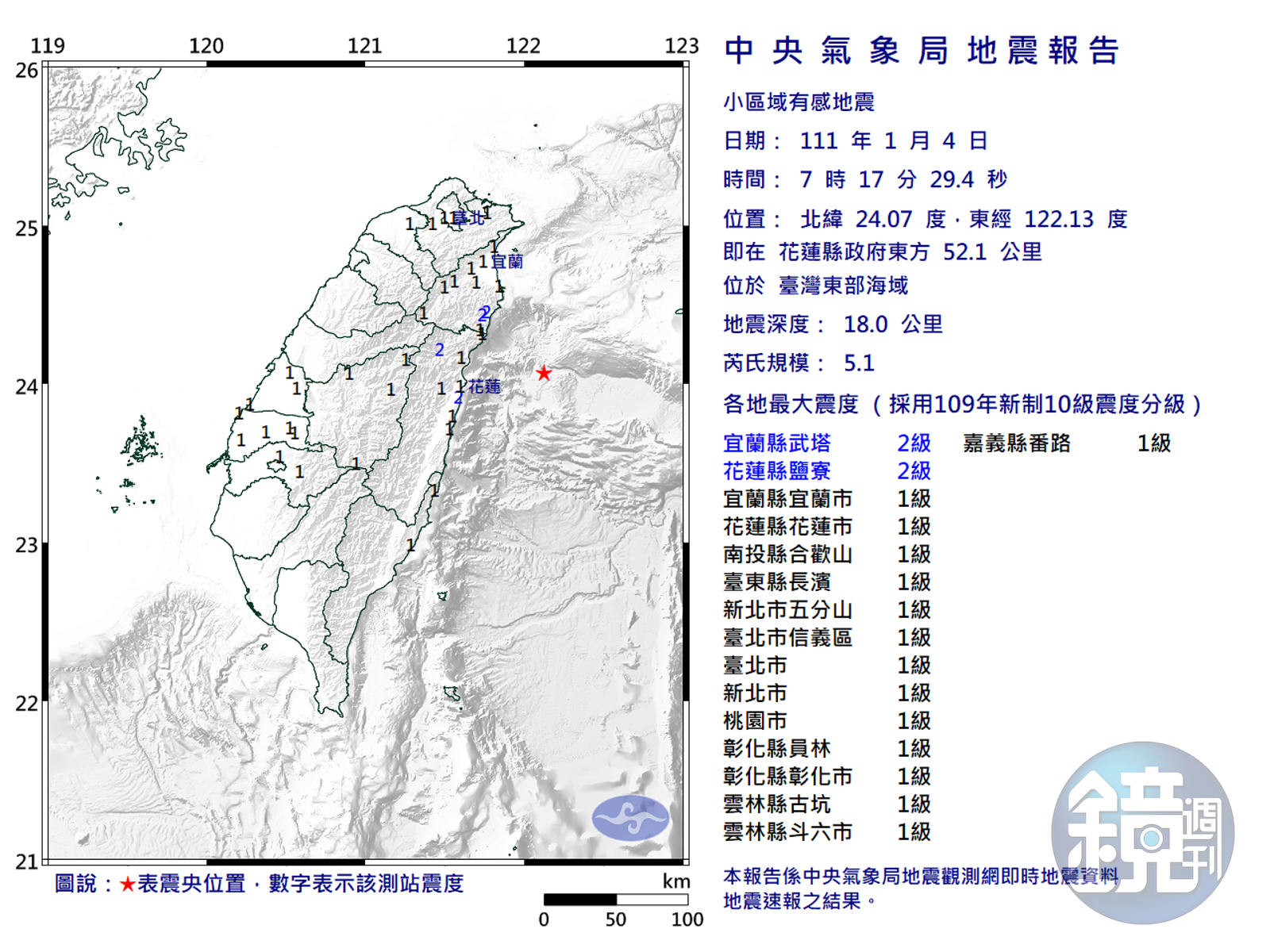 根據中央氣象局地震報告,震央位於花蓮縣政府東方52.1公里的台灣東部海域,地震深度18公里。宜蘭縣和花蓮縣最大震度2級,最大震度1級的縣市有:南投縣、台東縣、新北市、台北市、桃園市、彰化縣、雲林縣、嘉義縣 。 繼昨天(3日)17時46分全台有感芮氏規模6.0地震,氣象局表示未來3天還有規模5餘震,果真今早就發生規模5.1地震。 日本小笠原群島今天清晨6時9分(台灣時間5時9分)也發生規模6.3地震,地震深度70公里,最大震度5強,所幸無引起海嘯的危險。