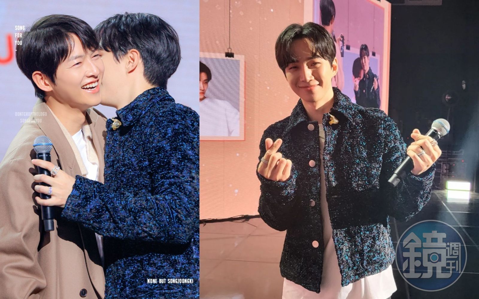 原來宋仲基與俊昊曾一起在運動綜藝《出發夢之隊2》當固定來賓,兩人從那時就建立起深厚的友誼,過去經常多次為對方作品應援還會送食物應援等;宋仲基在2018年舉行出道10周年粉絲見面會時,俊昊也曾作為嘉賓出席,如今禮尚往來,宋仲基義氣出席俊昊見面會,還拿起粉絲手機留下好兄弟合照,也讓粉絲們開心右鍵保存,瘋狂誇讚簡直是「神仙合體」的帥氣。